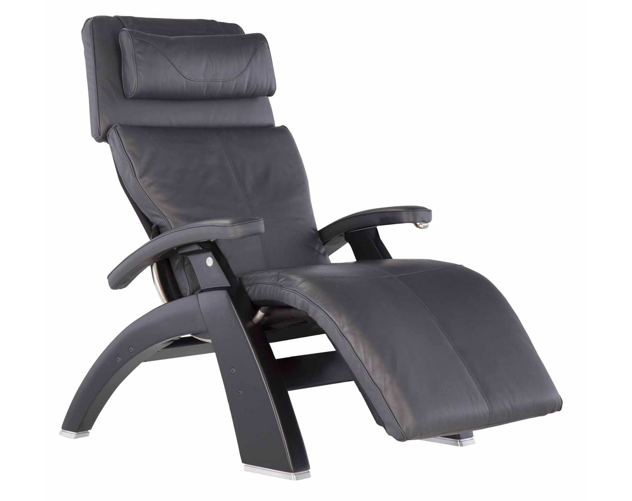Gray Premium Leather Matte Black Wood Base PC-420 Manual Recline Series 2 Perfect Chair Zero Gravity Recliner by Human Touch - Includes a Human Touch 7 Year In-Home Parts and Labor Warranty for New Perfect Chairs. The zero gravity position cradles your back and elevates your legs above your heart, which is the position that doctors recommend as the healthiest way to sit. Easy ingress and egress are achieved with the extended range of motion in the upright position. Exclusive Features Patented Orthonomic™ body frame with built-in lumbar curve. Extra wide legrest provides maximum comfort. The hand carved and finished base is pleasing to the eye, and constructed for years of use. The brake control system is easy to use and extremely reliable. Wedge-shaped, adjustable headrest cushion provides comfort for your head and neck. The adjustable headrest feature allows you to customize the optimum angle of comfort to maximize neck support while reading or watching television (Available on NEW and select Refurbished Chairs). Exclusive guide rail system for smooth recline motion and position control. Refurbished Chairs include a manufacturer's 90 Day Parts Limited Warranty*. New Perfect chairs include a manufacturer's 3 year limited warranty*. For a Power Electric Recline Version please see the PC-600 or PC-610 Omni-Motion Perfect Chair