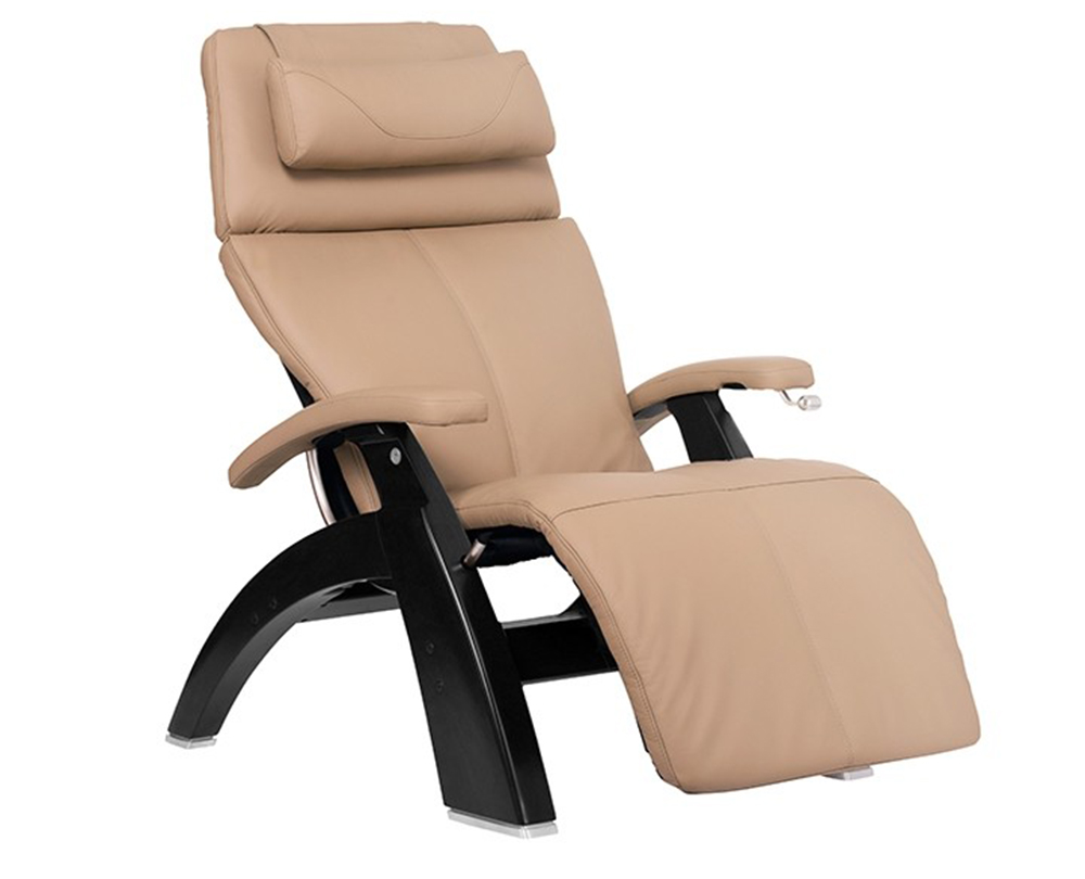 Sand Top Grain Leather Matte Black Wood Base PC-420 Manual Recline Series 2 Perfect Chair Zero Gravity Recliner by Human Touch - Includes a Human Touch 7 Year In-Home Parts and Labor Warranty for New Perfect Chairs. The zero gravity position cradles your back and elevates your legs above your heart, which is the position that doctors recommend as the healthiest way to sit. Easy ingress and egress are achieved with the extended range of motion in the upright position. Exclusive Features Patented Orthonomic™ body frame with built-in lumbar curve. Extra wide legrest provides maximum comfort. The hand carved and finished base is pleasing to the eye, and constructed for years of use. The brake control system is easy to use and extremely reliable. Wedge-shaped, adjustable headrest cushion provides comfort for your head and neck. The adjustable headrest feature allows you to customize the optimum angle of comfort to maximize neck support while reading or watching television (Available on NEW and select Refurbished Chairs). Exclusive guide rail system for smooth recline motion and position control. Refurbished Chairs include a manufacturer's 90 Day Parts Limited Warranty*. New Perfect chairs include a manufacturer's 3 year limited warranty*. For a Power Electric Recline Version please see the PC-600 or PC-610 Omni-Motion Perfect Chair