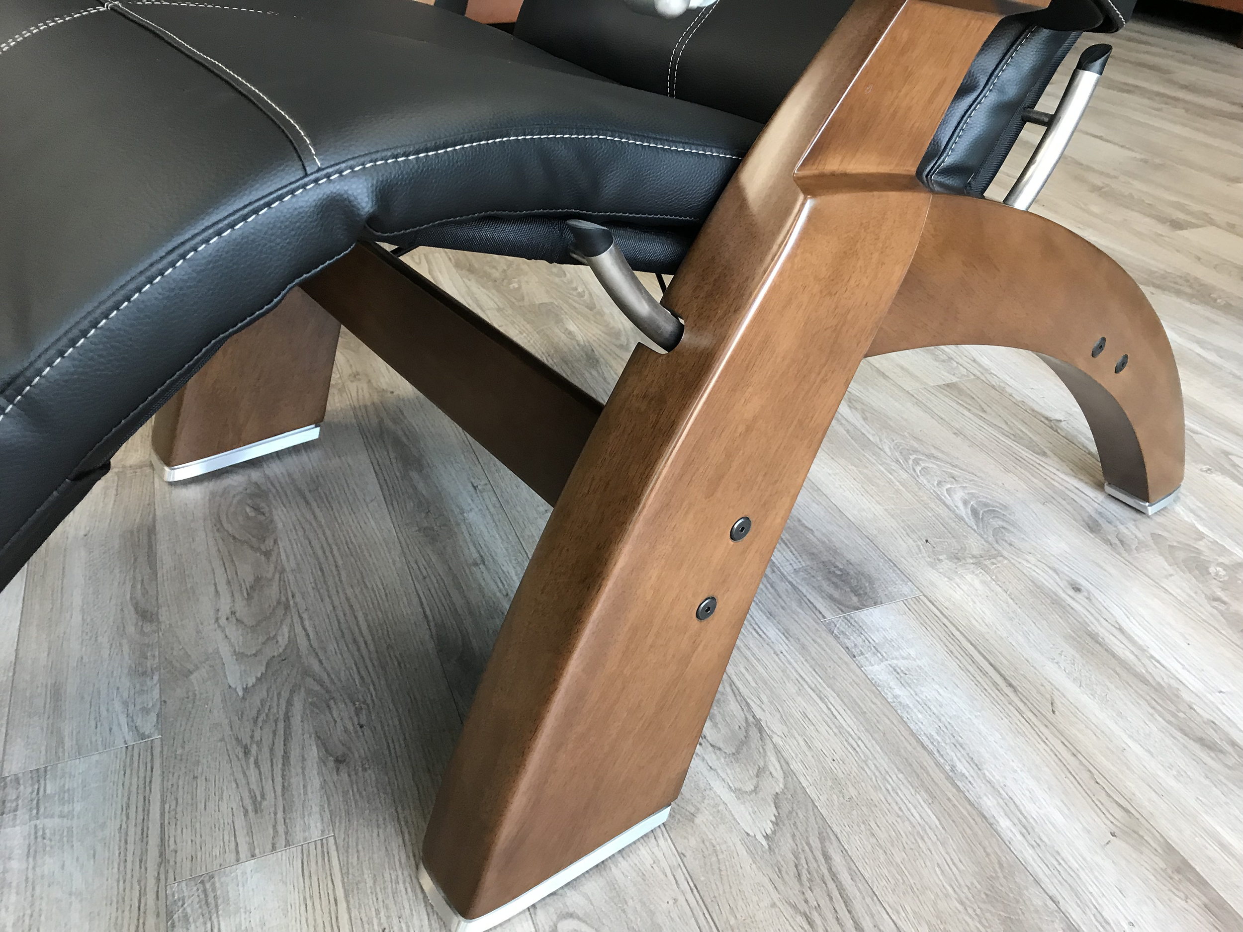 Black Top Grain Leather with a Walnut Wood Base PC-420 Manual Recline Series 2 Perfect Chair Zero Gravity Recliner by Human Touch - Includes a Human Touch 7 Year In-Home Parts and Labor Warranty for New Perfect Chairs. The zero gravity position cradles your back and elevates your legs above your heart, which is the position that doctors recommend as the healthiest way to sit. Easy ingress and egress are achieved with the extended range of motion in the upright position. Exclusive Features Patented Orthonomic™ body frame with built-in lumbar curve. Extra wide legrest provides maximum comfort. The hand carved and finished base is pleasing to the eye, and constructed for years of use. The brake control system is easy to use and extremely reliable. Wedge-shaped, adjustable headrest cushion provides comfort for your head and neck. The adjustable headrest feature allows you to customize the optimum angle of comfort to maximize neck support while reading or watching television (Available on NEW and select Refurbished Chairs). Exclusive guide rail system for smooth recline motion and position control. Refurbished Chairs include a manufacturer's 90 Day Parts Limited Warranty*. New Perfect chairs include a manufacturer's 3 year limited warranty*. For a Power Electric Recline Version please see the PC-600 or PC-610 Omni-Motion Perfect Chair