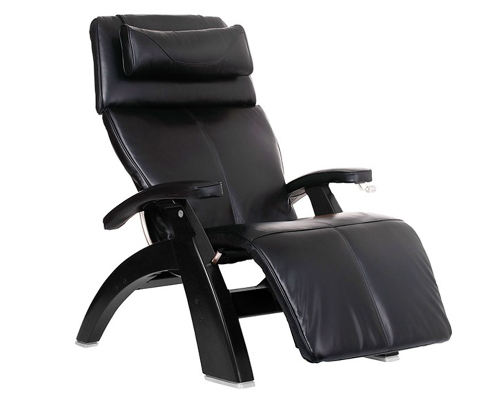 PC-LiVE Black Premium Leather Matte Black Wood Base PC-420 Manual Recline Series 2 Perfect Chair Zero Gravity Recliner by Human Touch - Includes a Human Touch 7 Year In-Home Parts and Labor Warranty for New Perfect Chairs. The zero gravity position cradles your back and elevates your legs above your heart, which is the position that doctors recommend as the healthiest way to sit. Easy ingress and egress are achieved with the extended range of motion in the upright position. Exclusive Features Patented Orthonomic™ body frame with built-in lumbar curve. Extra wide legrest provides maximum comfort. The hand carved and finished base is pleasing to the eye, and constructed for years of use. The brake control system is easy to use and extremely reliable. Wedge-shaped, adjustable headrest cushion provides comfort for your head and neck. The adjustable headrest feature allows you to customize the optimum angle of comfort to maximize neck support while reading or watching television (Available on NEW and select Refurbished Chairs). Exclusive guide rail system for smooth recline motion and position control. Refurbished Chairs include a manufacturer's 90 Day Parts Limited Warranty*. New Perfect chairs include a manufacturer's 3 year limited warranty*. For a Power Electric Recline Version please see the PC-600 or PC-610 Omni-Motion Perfect Chair