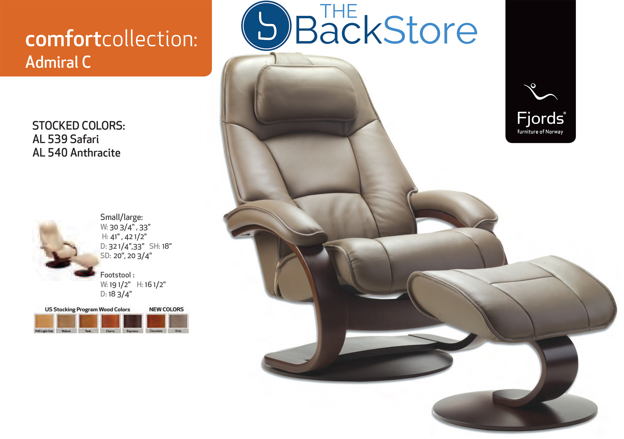 Fjords Admiral - Available with a R Frame or a C Frame Wood Stain Base. Leather Plush back, seat and headrest cushions for a more comfortable seating experience.