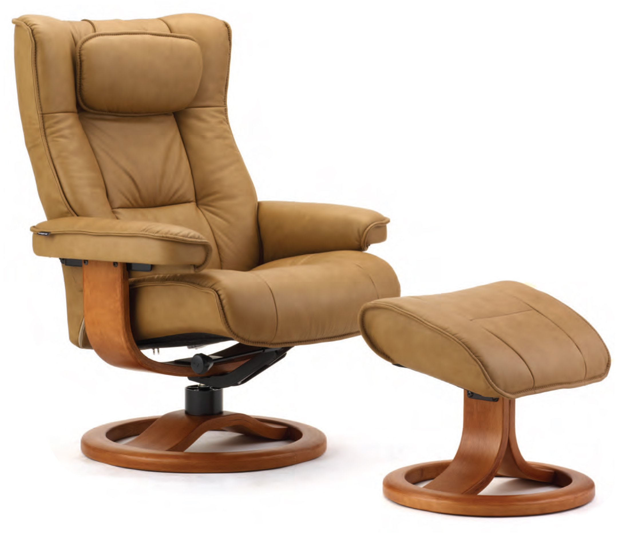 Genuine Fjords Soft Line Leather Regent Recliner and ottoman features the Fjords Active Release System. It is a unique integrated mechanism providing the best support for the neck. When desired, it can be adjusted with a single movement to optimize your sitting experience. It is an ergonomically designed chair that provides continuous support and comfort. It helps to prevent your legs and back from getting tired, relax your body and enable your blood to circulate more freely. It is designed to support your spine more correctly comfortably in the correct angle. Fjords utilizes cold cure molded foam in the seat, back, armrest and ottoman. Cast molded cold cure foam retains its suppleness longer than standard block molded foam in order to retain its durability and physical appearance. The unique gliding mountings that are built in to the chairs provide he best individual resting position. The weight of the body determines the chair position. Laminated wood base available in five finishes (Teak, Cherry, Walnut and Espresso).