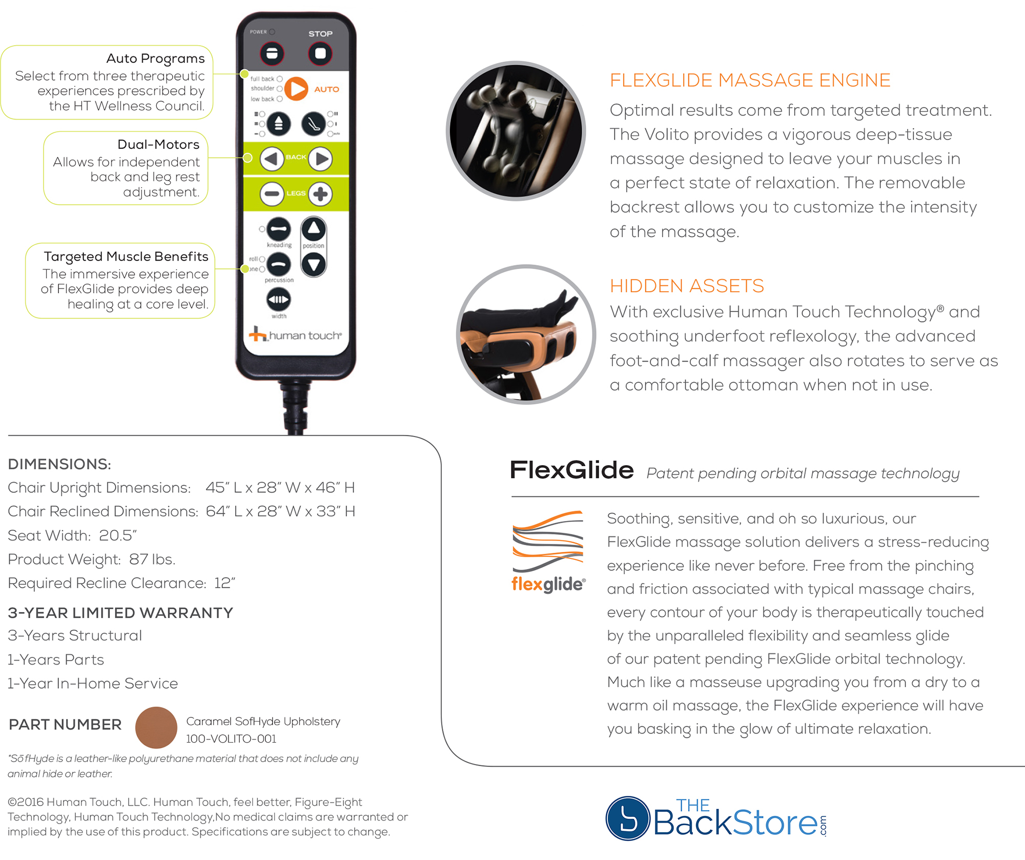 Human Touch Volito ZeroG Zero Gravity Massage Chair Recliner Specifications