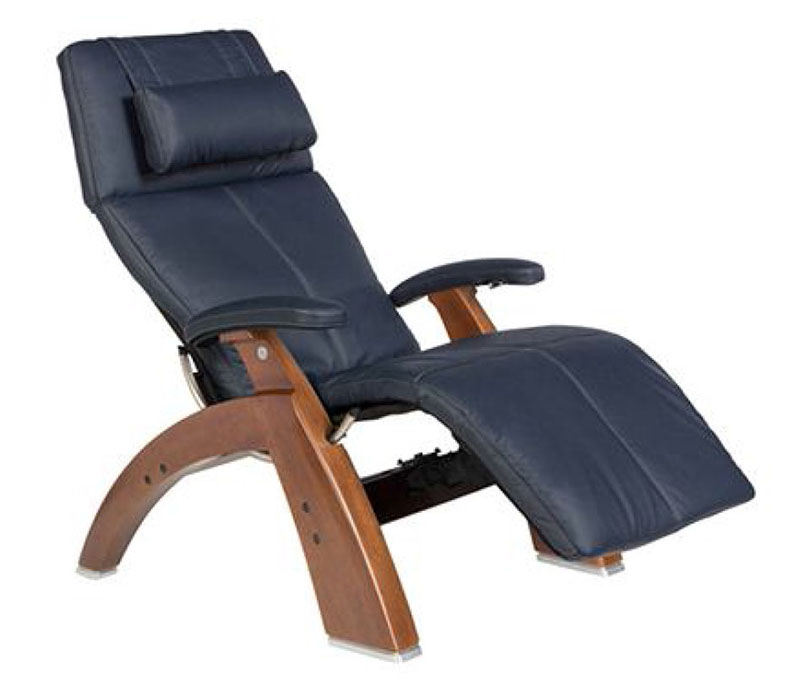 Navy Blue Top Grain Leather with a Walnut Wood Base Series 2 Perfect Chair Zero Gravity Power Recliner by Human Touch - The zero gravity position cradles your back and elevates your legs above your heart, which is the position that doctors recommend as the healthiest way to sit. Easy ingress and egress are achieved with the extended range of motion in the upright position. Exclusive Features Patented Orthonomic™ body frame with built-in lumbar curve. Extra wide legrest provides maximum comfort. The hand carved and finished base is pleasing to the eye, and constructed for years of use. The brake control system is easy to use and extremely reliable. Wedge-shaped, adjustable headrest cushion provides comfort for your head and neck. The adjustable headrest feature allows you to customize the optimum angle of comfort to maximize neck support while reading or watching television (Available on NEW and select Refurbished Chairs). Exclusive guide rail system for smooth recline motion and position control. Refurbished Chairs include a manufacturer's 90 Day Parts Limited Warranty*. New Perfect chairs include a manufacturer's 3 year limited warranty*. Brand new Series 2 PC-600 Silhouette Omni Motion Power Perfect Chair Recliner, Series 2 PC-610 Omni Motion Power Perfect Chair Recliner, Series 2 Classic PC-500 Silhouette Power Perfect Chair Recliner, Series 2 Classic PC-510 Power Perfect Chair Recliner, Series 1 Classic PC-075 Silhouette Power Perfect Chair Recliner and Series 1 Classic PC-095 Power Perfect Chairs have a folding footrest to allow easier entry and exit from the chair. The Newest Series 2 PC-600 Silhouette Omni Motion Power Perfect Chair Recliner, Series 2 PC-610 Omni Motion Power Perfect Chair Recliner have a 5-Way Controller to give you maximum control of your Perfect Chair experience. With the New PC-600 and PC-610 you can now control the footrest independently of the backrest to give you even more positional control. See Pictures Here.