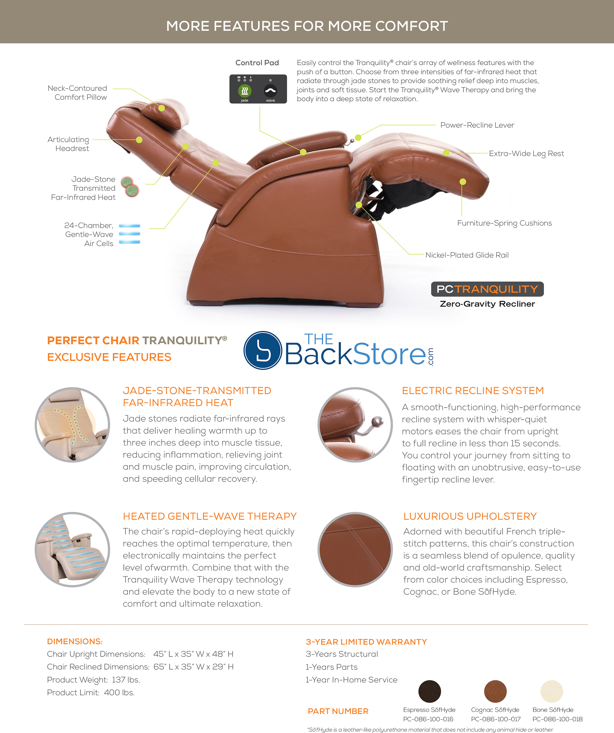 Electric PC-086 Perfect Chair MSRP: $3999 Shipping: Standard Continental USA Ground Shipping Included. Human Touch Perfect Chair PC-086 Tranquility Power Zero-Gravity Recliner with Jade Heat and Air Massage - We've seamlessly integrated Earth’s natural elements and the healing arts of the Far East into an amazingly luxurious chair that soothes tired, aching muscles, elevating the body to a new state of comfort and relaxation. Inspired by the Neutral Body Posture position developed by NASA to support astronauts’ ascent into orbit, the Perfect Chair’s frame ergonomics put the body in a virtually weightless position that physicians recommend as the healthiest way to sit. Within the chair lies an equally stunning advancement: jade stones that radiate farinfrared heat up to three inches deep into muscle tissue to create healing warmth that can be felt long after you leave the chair. Add to that full-body, Tranquility Wave Therapy technology and you’ve reached the perfect bliss. Tranquility, as we call it. Power Electric Recline System. The Zero Gravity Neutral Position cradles your back and elevates your legs above your heart. Easy ingress and egress are achieved with the extended range of motion in the upright position. Jade Heat is a Stone-Transmitted Heated Gentle-Wave Far-Infrared Therapy. Extra wide legrest provides maximum comfort. Luxurious SoftHyde Vinyl Easy Clean Upholstery. The adjustable headrest feature allows you to customize the optimum angle of comfort to maximize neck support while reading or watching television. Exclusive guide rail system for smooth recline motion and position control. Upright Dims 45"L X 35"W X 48"H, Reclined Dims 65"L X 35"W Reclined Headrest Height 27", Reclined Footrest Height 29", Seat Width 23" Gross weight (in box) 155 lbs, Maximum Load Weight 400 lbs Required Recline Clearance is 12" 3-Year Warranty - 3Yr Structural, One Year In-Home Parts & Labor Box Dims 56"L X 36"W X 46"H Exclusive Features of the PC-086 Perfect Chair Recliner: