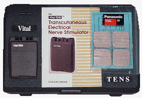 TENS Unit / muscle stimulation device with Timer. Many types of pain which are often relieved with drugs can today be treated by electrical stimulation with no side effects. Pain relief with TENS (Transcutaneous Nerve Stimulation) is produced through high frequency electrical stimulation of the nerve which disrupts the pain signal so that the pain is no longer felt. VITAL TENS DELUXE - Dual Channel four pad Tens with timer and burst mode. Adjustable pulse rate and pulse width. Includes 3 packs of 4 electrodes, hard plastic case, battery, lead wires and more. One Year warranty.  Compare at $500